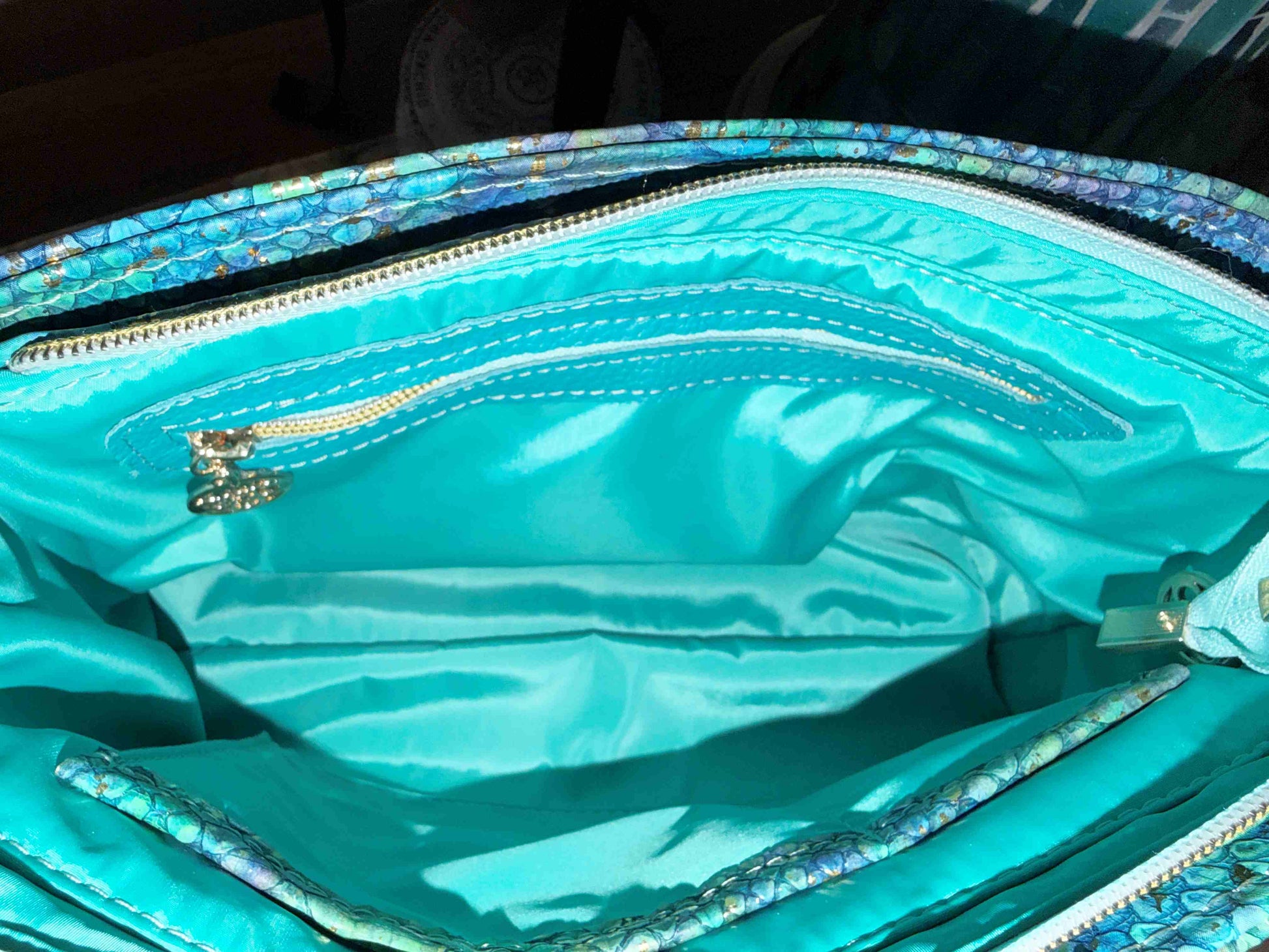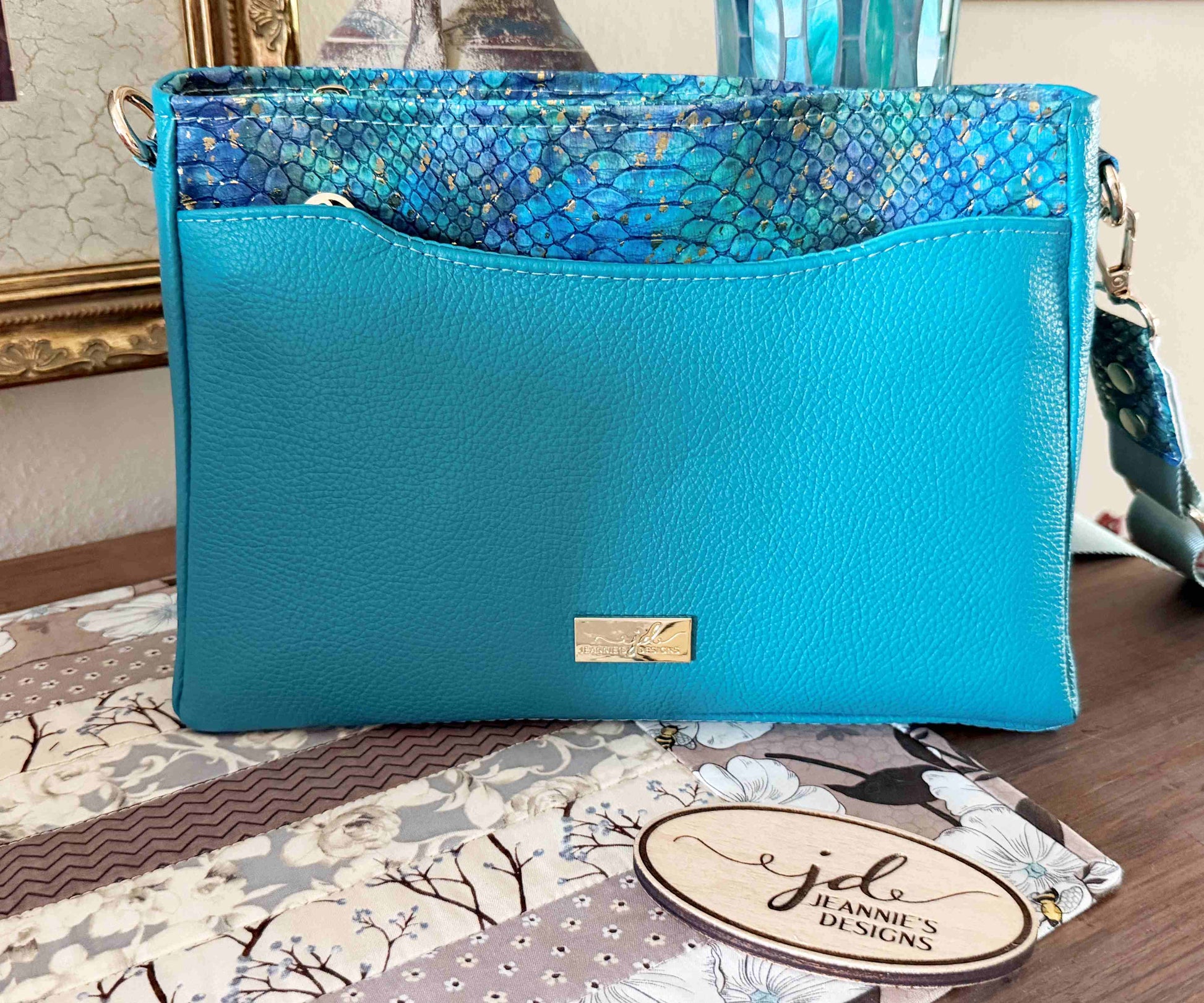 This is such a versatile bag for nearly anytime! Lots of room yet not too big! Teal Leather for exterior with Mermaid Vinyl accents and Teal bonded nylon for the lining
